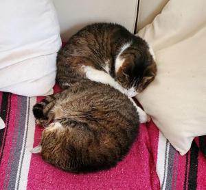 While I tried to coax her to calm, offering treats and assurances to no avail, Cleo simply sat still and let her hiss and snarl at her, never engaging or taking flight. She stayed close when Sasha clearly wanted nothing to do with her. It took a few days, but I came home one afternoon from an errand to find the two cats on the bed, Sasha nestled into Cleo just as she had always done.